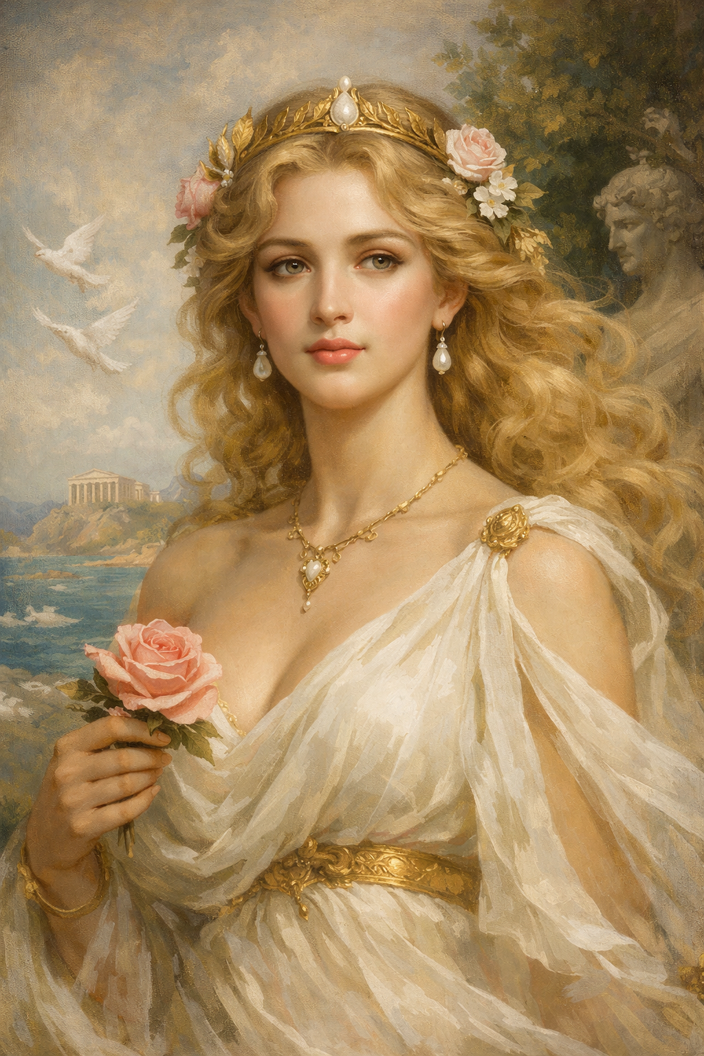 Afrodita es la diosa del amor, la belleza y el deseo. Su origen es debatido: nació de la espuma del mar formada por los genitales de Urano, o es hija de Zeus y Dione.