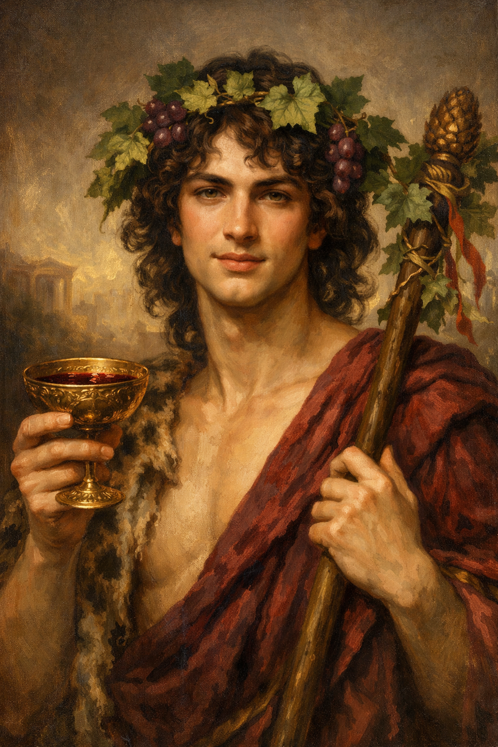 Dioniso es el dios del vino, la fertilidad, el teatro y el éxtasis ritual. Hijo de Zeus y la mortal Sémele. Nació dos veces: primero del vientre de su madre y después del muslo de Zeus.
