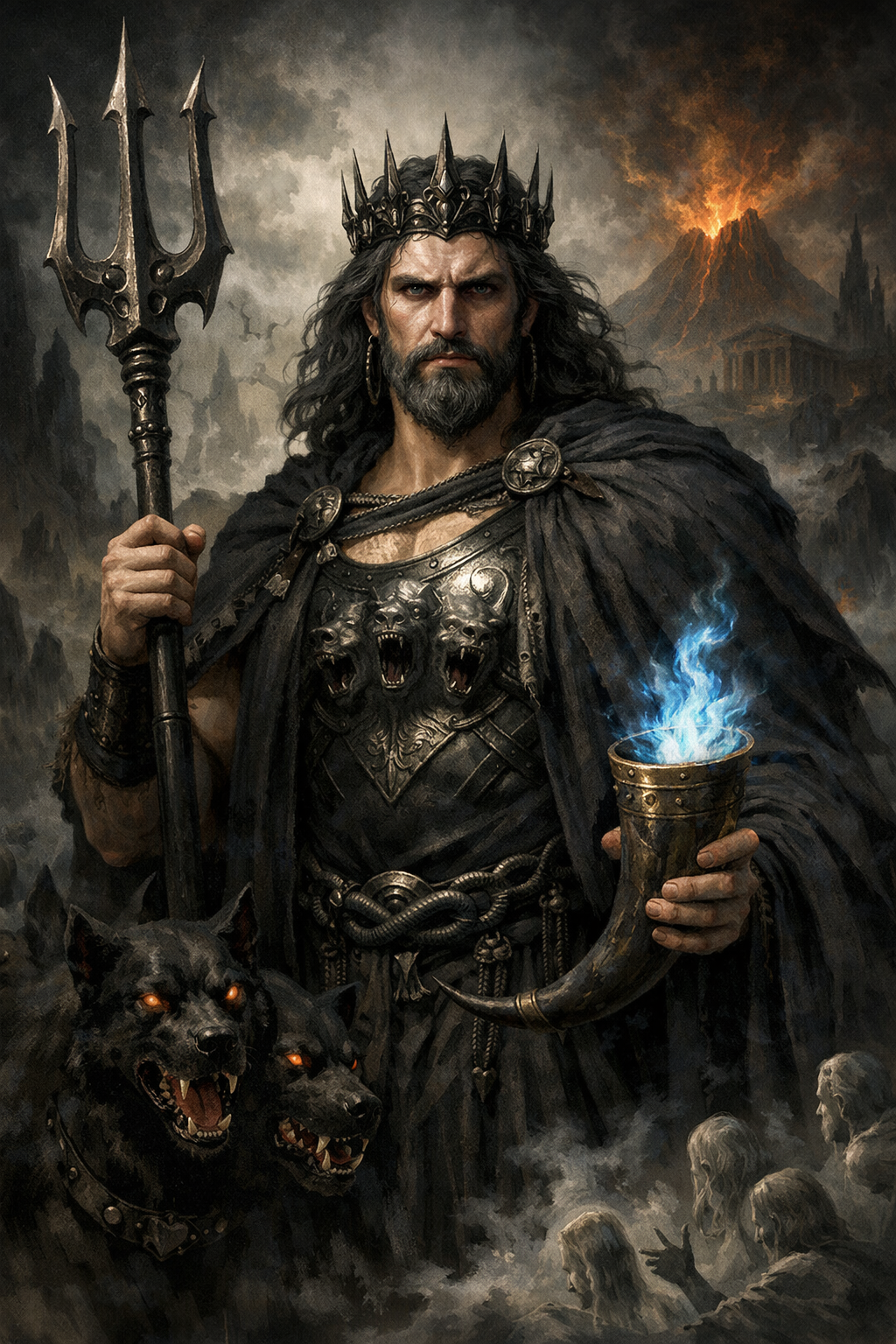 Hades es el dios del inframundo y de los muertos. Aunque no es malvado, es temido por todos. Raptó a Perséfone para convertirla en su reina, lo que provocó el mito de las estaciones.