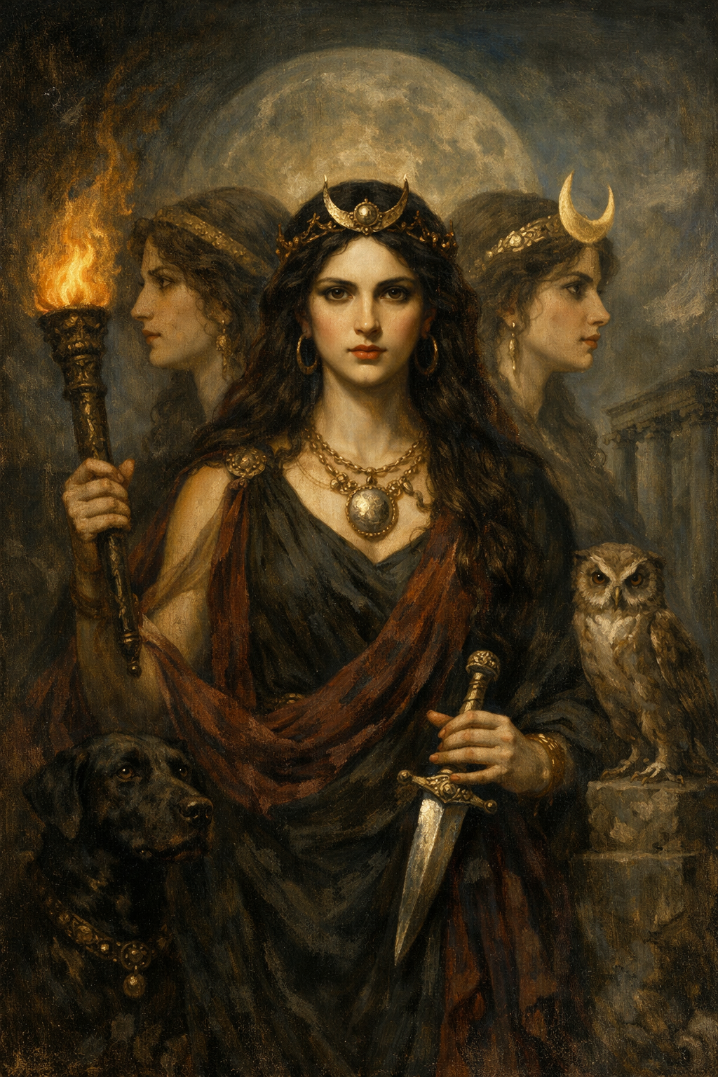Hécate es la diosa de la magia, la hechicería, las encrucijadas y la noche. Hija de Asteria y Perses. Zeus la honró sobre todos los demás titanes y le permitió conservar sus dominios.