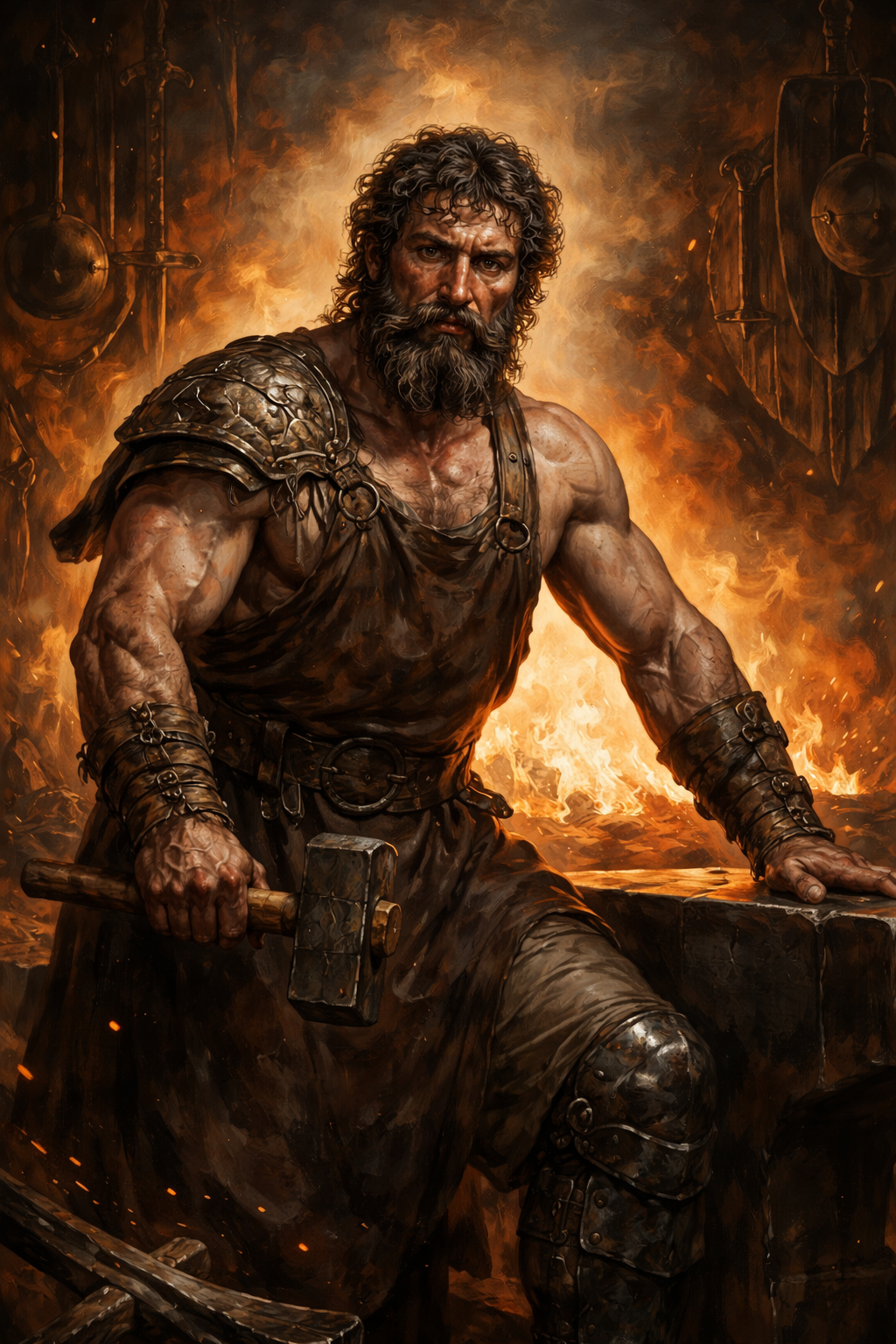 Hefesto es el dios del fuego, la metalurgia y los artesanos. Nació deforme y fue arrojado del Olimpo. Forjó las armas y armaduras de los dioses, incluido el rayo de Zeus y la armadura de Aquiles.