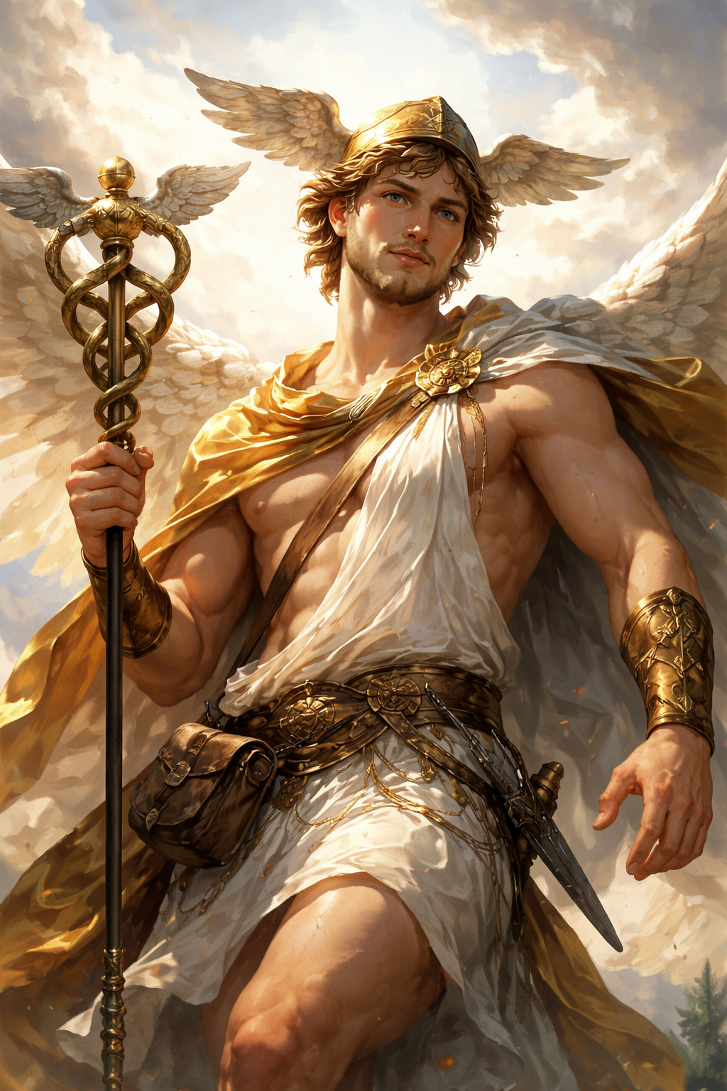 Hermes es el dios mensajero, patrón de los viajeros, los comerciantes, los ladrones y los oradores. Guía de las almas al inframundo (psicopompo). Hijo de Zeus y la pléyade Maya.