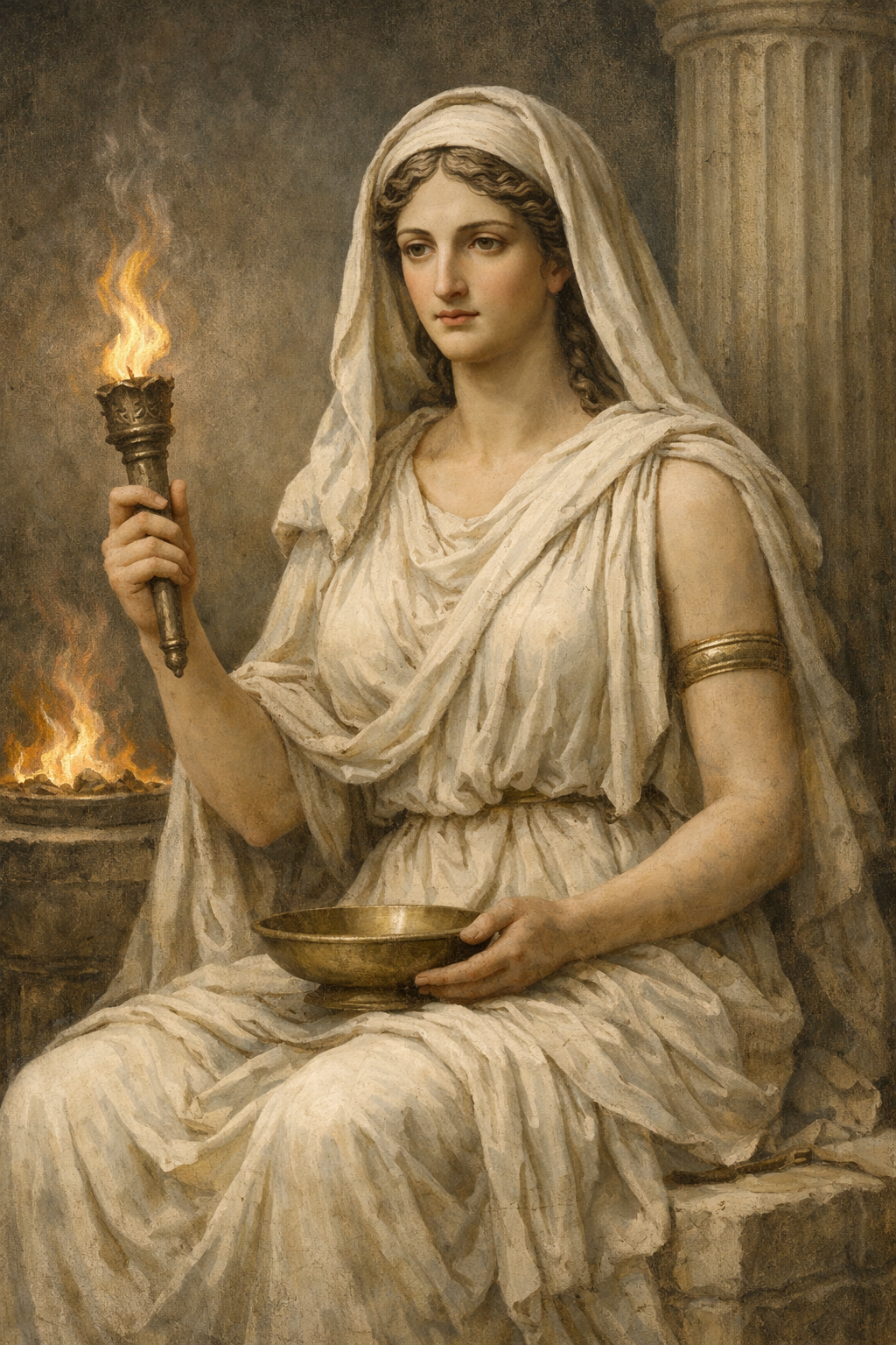 Hestia es la diosa del hogar, la familia y el fuego sagrado. La primogénita de Cronos y la primera en ser devorada. Juró virginidad eterna y cedió su asiento en el Olimpo a Dioniso.