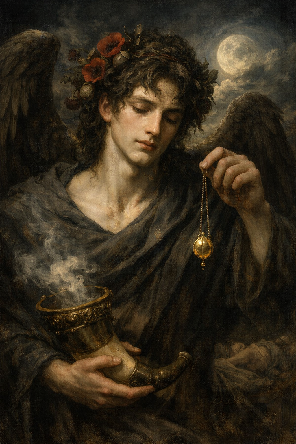 Hipnos es la personificación del sueño. Hermano gemelo de Tánatos. Vive en una cueva donde nunca brilla el sol.
