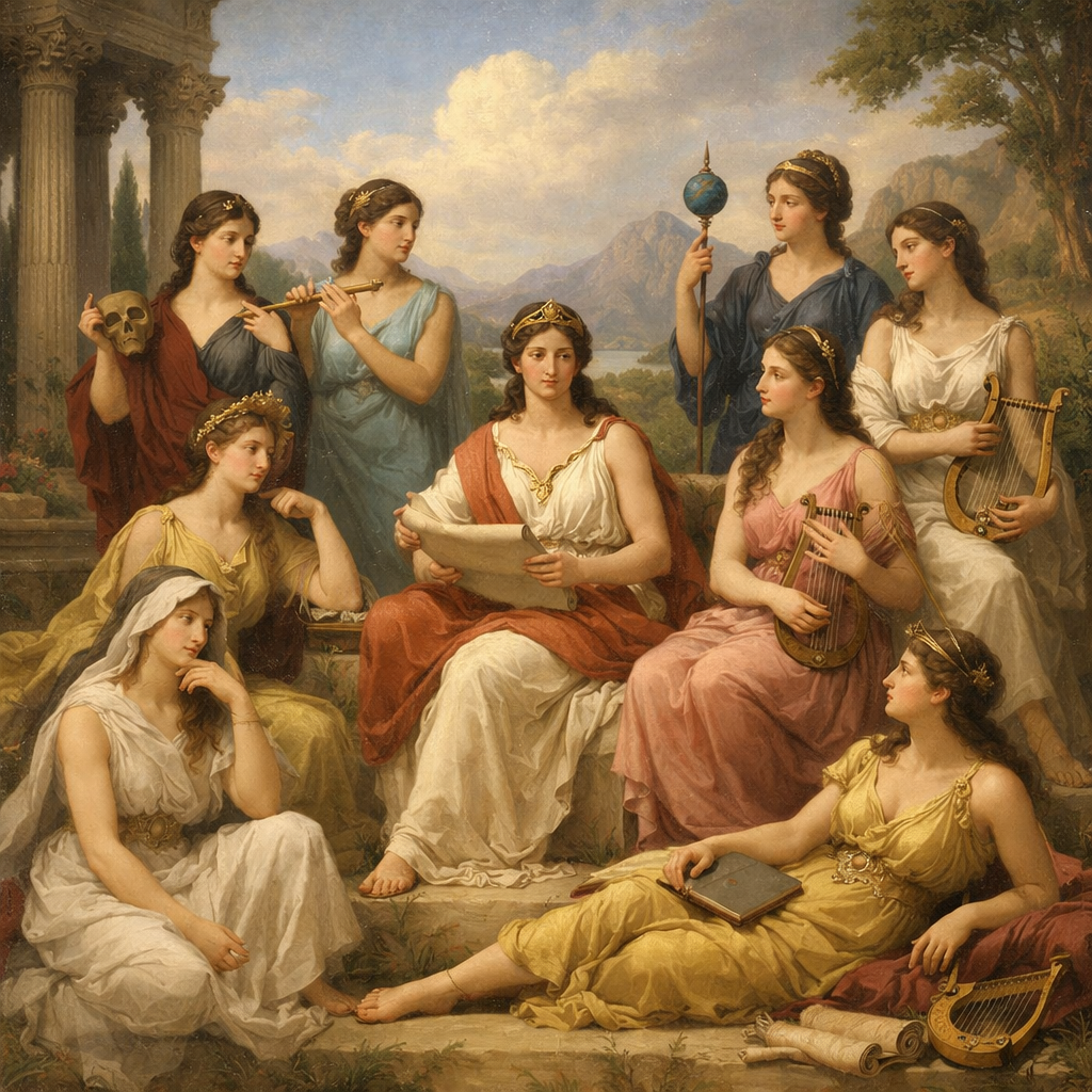 Las nueve Musas son hijas de Zeus y Mnemósine. Cada una preside un arte: Clío (historia), Euterpe (música), Talía (comedia), Melpómene (tragedia), Terpsícore (danza), Erato (poesía amorosa), Polimnia (himnos), Urania (astronomía) y Calíope (poesía épica).