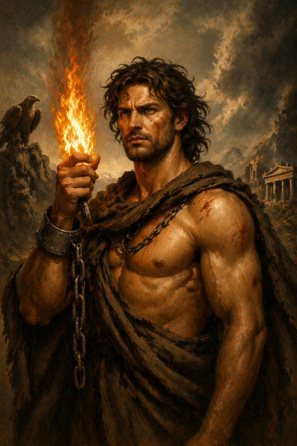 Prometeo es el titán que robó el fuego de los dioses para dárselo a la humanidad. Zeus lo castigó encadenándolo a una roca en el Cáucaso, donde un águila le devoraba el hígado cada día, que se regeneraba por la noche.