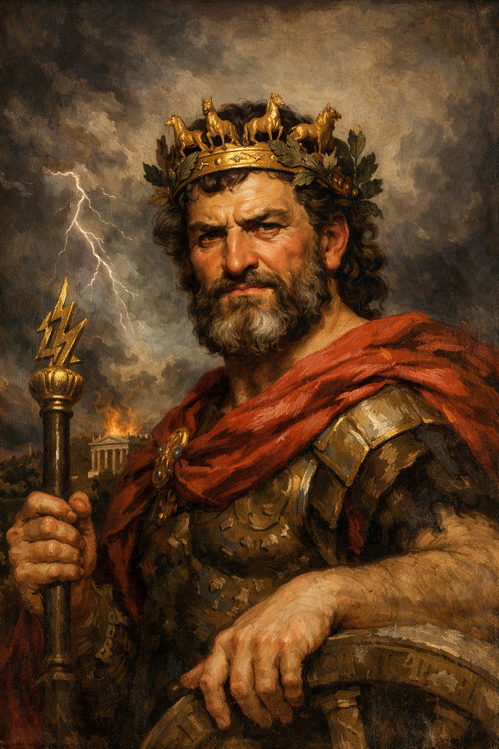 Salmoneo es hijo de Eolo. Se atrevió a imitar los truenos y rayos de Zeus, quien lo fulminó y destruyó su ciudad.