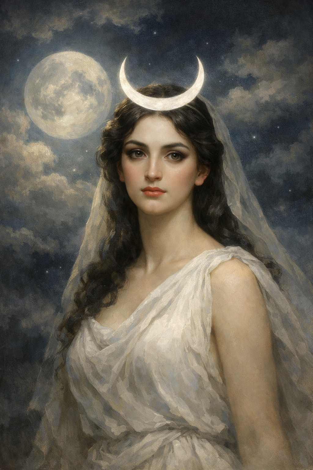 Selene es la titánide de la Luna. Conduce su carro plateado por el cielo nocturno. Se enamoró perdidamente del mortal Endimión.