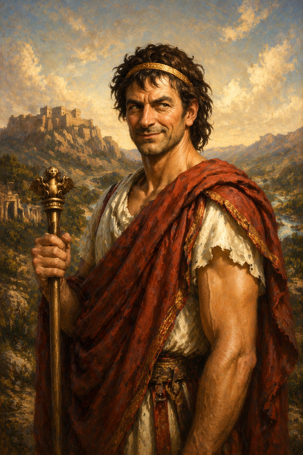 Sísifo es el fundador y primer rey de Corinto (Éfira). Famoso por su astucia, engañó a la Muerte (Tánatos) dos veces. Como castigo eterno, fue condenado a empujar una enorme roca cuesta arriba que siempre vuelve a caer antes de llegar a la cima.