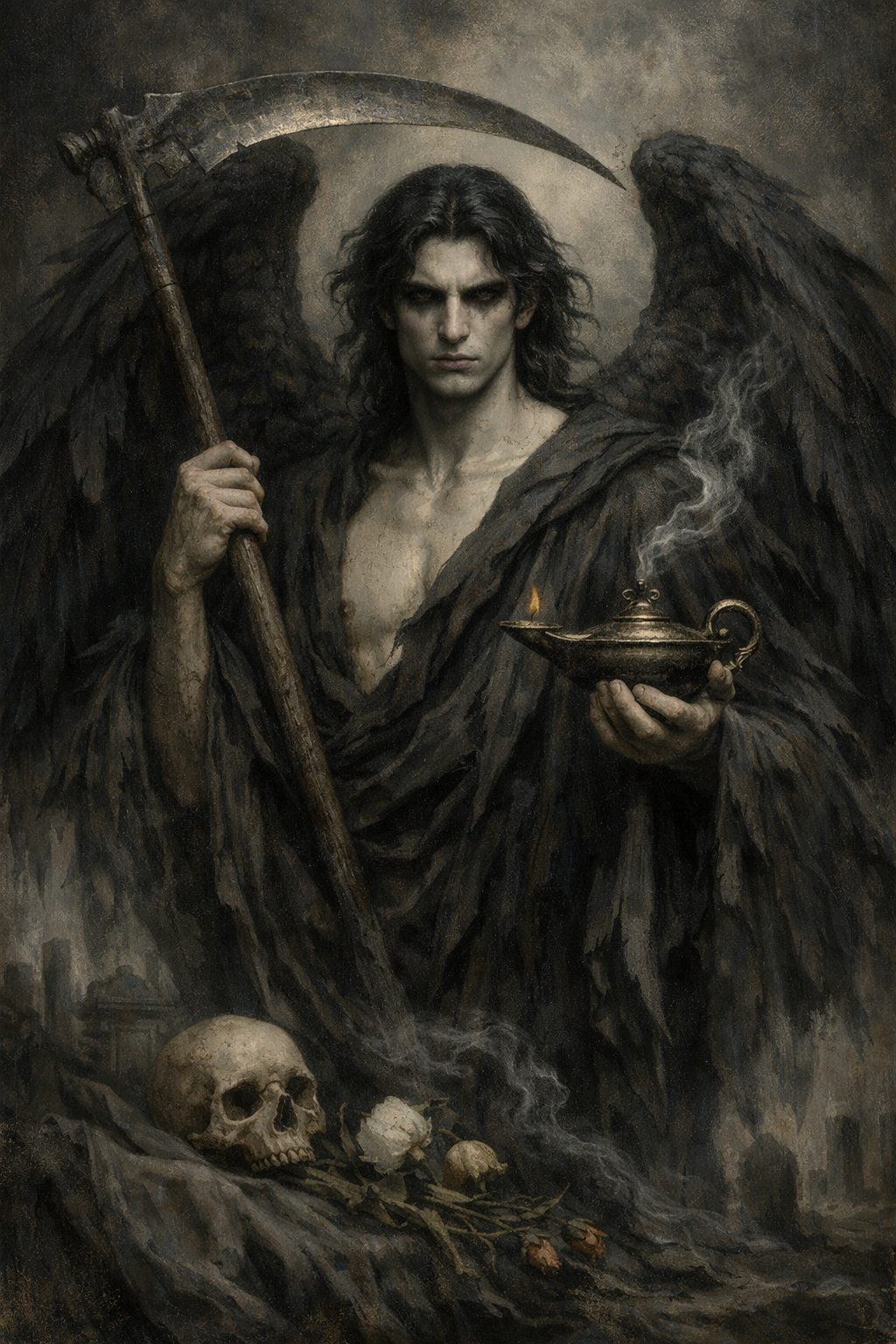 Tánatos es la personificación de la muerte no violenta. Hermano gemelo de Hipnos (el Sueño). Fue encadenado por Sísifo.