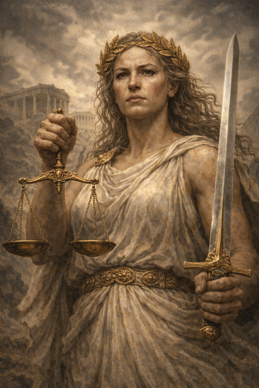 Temis es la titánide de la justicia divina, la ley y el orden. Fue la segunda esposa de Zeus y madre de las Horas y las Moiras.